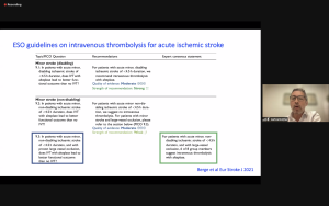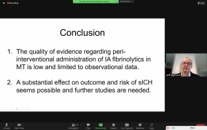 The second speaker and co-host, dr. Daniel Strbian, went into treatment of basilar artery occlusions. For this patient group with generally poor outcome, hopes were high for EVT until the BEST and BASICS trial results became known. Recruitment was slow in these trials, with many patients treated outside of the trial. Both trials showed equivocal benefit between the modalities regarding 90-day functional outcome despite higher vessel patency rates in the EVT arms. Only 30% of patients in the standard treatment arm received IVT in BEST, so the comparison was not even. In BASICS, this was 80%. Dr. Strbian also outlined high recanalization rates after IVT in basilar artery occlusion. He concluded that IVT remains an efficient treatment for basilar artery occlusion, EVT can be used as a rescue procedure in case of severe or deteriorating stroke, and doing trials is difficult but may be needed.