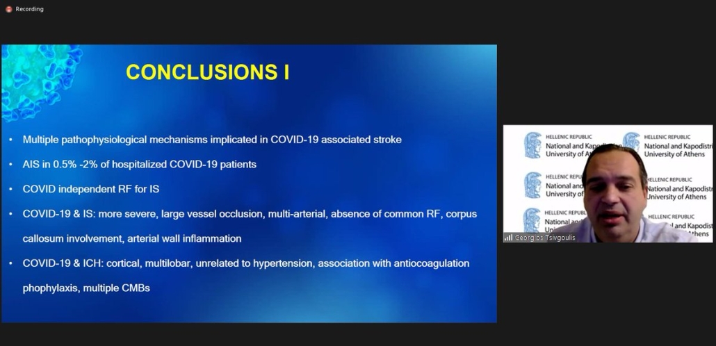 Our keynote speaker Georgios Tsivgoulis gave a very comprehensive overview of different aspects of cerebrovascular disease in patients with COVID-19. In contrast to the initial report of a high prevalence of 5% from Wuhan, subsequent studies showed that prevalence of stroke was around 1-2% with ischaemic stroke being most common. Of all the ischaemic stroke subtypes, there seemed to be a considerably high rate of large vessel occlusion and a high proportion of cryptogenic stroke. Mechanisms behind the link of COVID-19 and cerebrovascular disease are complex but evidence from self-controlled case series and matched cohort study showed a convincing temporal relationship suggesting that the association might be causal, which also highlighted the importance of vaccination. One other important issue raised was the impact of COVID-19 on stroke care across the world. The pandemic saw a marked decline of acute stroke hospitalisation and the use of acute stroke treatment. Whilst the reasons are multifactorial including both patient behaviour change and service provision adaptation, many important lessons have been learnt.
