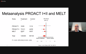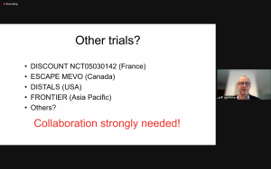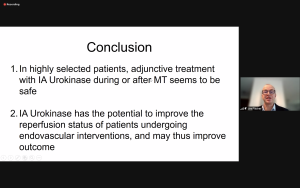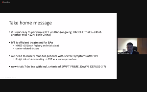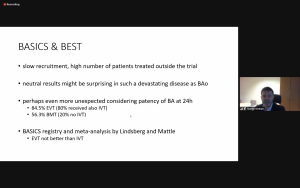 The second speaker and co-host, dr. Daniel Strbian, went into treatment of basilar artery occlusions. For this patient group with generally poor outcome, hopes were high for EVT until the BEST and BASICS trial results became known. Recruitment was slow in these trials, with many patients treated outside of the trial. Both trials showed equivocal benefit between the modalities regarding 90-day functional outcome despite higher vessel patency rates in the EVT arms. Only 30% of patients in the standard treatment arm received IVT in BEST, so the comparison was not even. In BASICS, this was 80%. Dr. Strbian also outlined high recanalization rates after IVT in basilar artery occlusion. He concluded that IVT remains an efficient treatment for basilar artery occlusion, EVT can be used as a rescue procedure in case of severe or deteriorating stroke, and doing trials is difficult but may be needed.