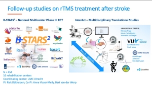 This was nicely demonstrated by prof. Dijkhuizen In the next part of his talk with the example of repetitive transcranial stimulation (rTMS). rTMS can be used post-stroke to modulate the cortical excitability. To bring rTMS from bench to bedside, a large platform was setup within UMC Utrecht. First, a meta-analysis showed that starting rTMS within 1-month post-stroke, was the most optimal timing. Preclinical research with rat models and skilled research as an outcome measure was started, for which the results are still blinded. In addition, a phase 2 clinical trial (B-stars), investigating the effect of contralateral cTMS (continuous theta burst stimulation) on upper limb recovery, has started. The results of this trial were recently published in Stroke (Vink et al. 2023) and showed a significant effect on upper limb recovery compared to the group with sham stimulation. A large national multicenter phase 3 RCT, called B-STARS2 will soon start, and we are all looking forward to the results of a large, definitive trial in the field of neurorehabilitation.
