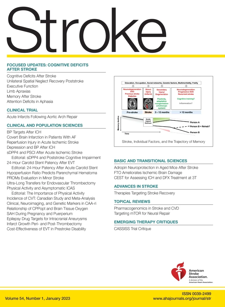 Stroke, an official scientific journal of the American Heart Association/American Stroke Association. Stroke is the top-ranked journal in its field and publishes articles focused on clinical and basic investigation of any aspect of the cerebral circulation and its diseases from many disciplines.